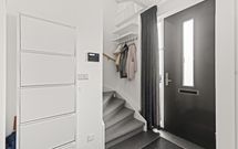 Entree in hal met gestoffeerde trapopgang naar de verdieping, meterkast (5 groepen, 2x aardlekschakelaar en glasvezel) en volledig betegelde moderne toiletruimte met wandcloset en fonte