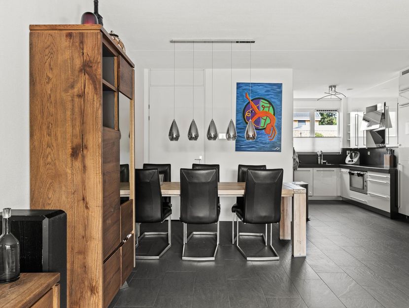 Living met tegelvloer voorzien van vloerverwarming, handige trapkast met praktische bergruimte, keukeninrichting aan de voorzijde en door de uitbouw aan achterzijde is er een fijne ruime zithoek met openslaande deuren naar de achtertuin.