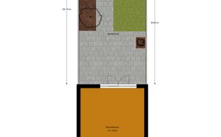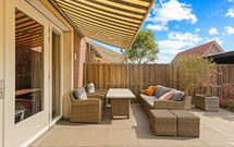 Zonnige achtertuin op het zuidoosten, terras met elektrisch bedienbaar zonnescherm, buitenkraan, hardhouten schuttingen, straatwerk met verlichting, gecombineerd met gras en groenborder. Buitenkeuken met spoelbak, warmwateraansluiting en stroom, houten tuinberging en achterom.