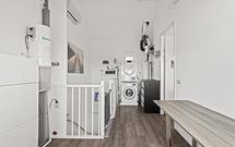 Ruime voorzolder met kunststof dakkapel, laminaatvloer, veel bergruimte, opstelling Ferolli cv-ketel (2007) en mv-unit (2024), wasmachine- en drogeraansluiting en de unit van het centraal stofzuigersysteem.
