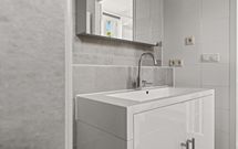 Vergrote, moderne badkamer, volledig betegeld met 2 gevelraampjes waardoor veel daglicht, een ligbad (whirlpool), wastafelmeubel met verwarmde spiegel, twee handdoekenkasten, douchecabine met stortdouche en handdoekradiator.