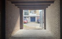 Stenen garage voorzien van dubbele houten deur. Deze garage heeft een ideale ligging precies op een hoek van dit garageblok.
