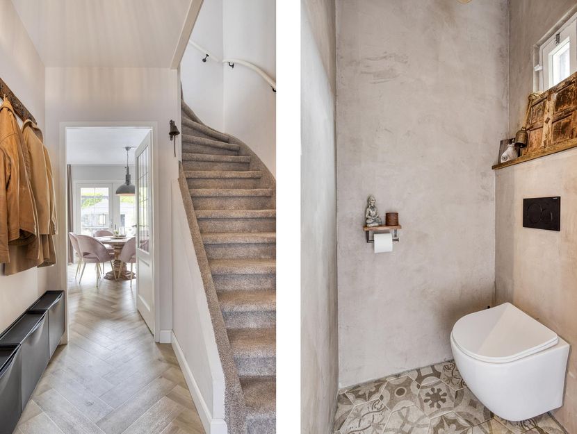 Entree via de verzorgde voortuin in ruime hal met meterkast, moderne toiletruimte met wandcloset en gestoffeerde trapopgang naar de eerste verdieping.