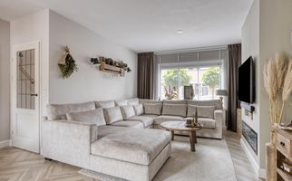 ige woonkamer is ontstaan doordat de keuken is verplaatst naar de uitbouw. Deze fijne leefruimte beschikt over een trapkast, een zijraam dat zorgt voor extra lichtinval en openslaande deuren naar de achtertuin. De sfeervolle zithoek aan de voorzijde heeft een fraaie elektrische haard.